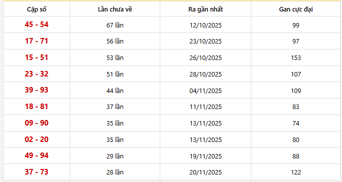 ⭐️ Cặp lô khan XSMB ít về nhất: 45 - 54 (67 lần), 17 - 71 (56 lần), 15 - 51 (53 lần), 23 - 32 (51 lần), 39 - 93 (44 lần)
