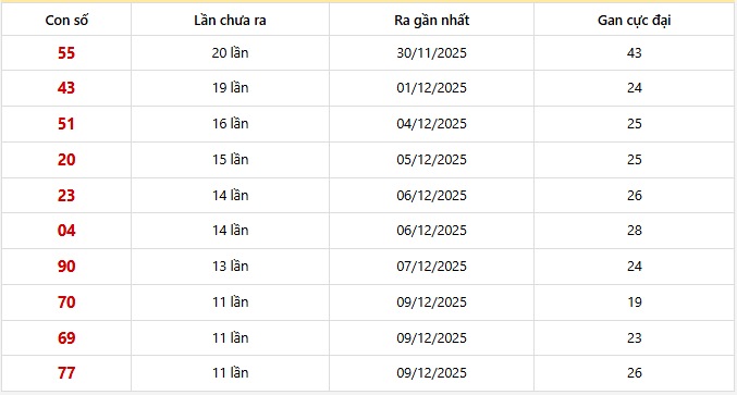 ⭐️ Cặp số lâu xuất hiện nhất XSMB (30 kỳ quay): 55 - 43 - 51 - 20 - 04 - 23