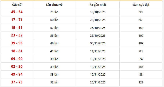 ⭐️ Cặp lô khan XSMB ít về nhất: 45 - 54 (71 lần), 17 - 71 (60 lần), 15 - 51 (57 lần), 23 - 32 (55 lần), 39 - 93 (48 lần)