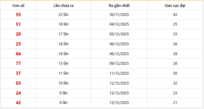⭐️ Cặp số lâu xuất hiện nhất XSMB (30 kỳ quay): 55 - 51 - 20 - 23 - 04 - 77