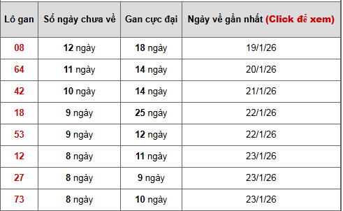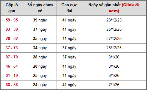 Dựa trên bảng cặp số lô gan XSMB hiện tại, có thể thấy nhiều cặp số đang rơi vào vùng gan sâu – cận mốc cực đại, rất đáng chú ý cho giai đoạn dự đoán xổ số miền bắc ngày mùng 1 tháng 2.