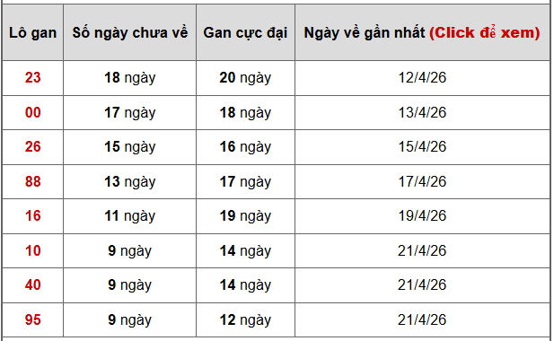 🔹 00 (17 ngày) và 26 (15 ngày) cũng thuộc nhóm lâu chưa xuất hiện, thường có xu hướng bật lại mạnh, dễ góp mặt trong các dự đoán xổ số miền Bắc ngày 1/5/2026.