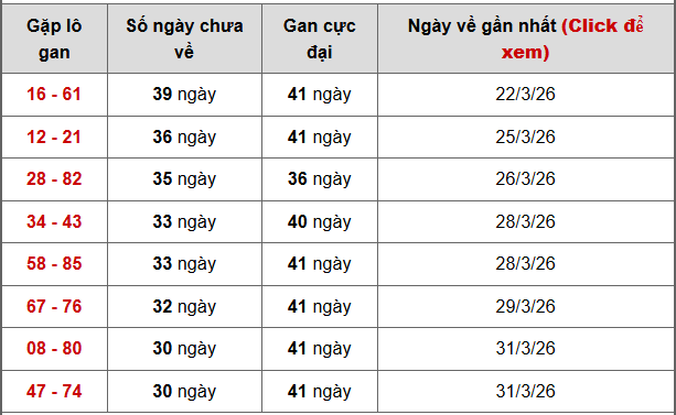 - Bảng thống kê lô gan Miền Bắc lâu chưa về tính đến ngày 1/5/2026