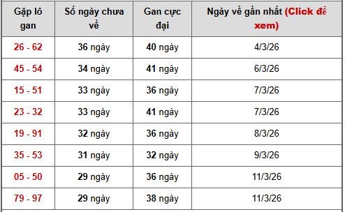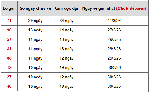 👉 Tổng thể bảng gan cho thấy 71 là lô gan sâu nhất và đáng chú ý nhất, trong khi 96, 57, 88 lại là nhóm đang sát gan cực đại – rất dễ xuất hiện trong các kỳ quay sắp tới theo chu kỳ thống kê, phù hợp để tham khảo khi soi cầu miền bắc ngày mùng 10 tháng 4 năm 2026.