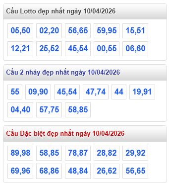 Lưu ý : "Quy luật đẹp nhất" là do hệ thống tự động tính toán theo một số tiêu chí mà XỔ SỐ WAP tính toán. Các bạn nên tham khảo dự đoán kết quả xổ số miền Bắc ngày 10 tháng 4 năm 2026 để tìm ra cặp xổ số đẹp nhất.