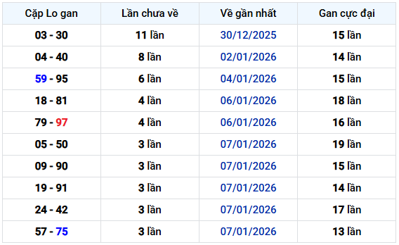 - Bảng cặp số lô gan XSMB ngày 11/1/2026
