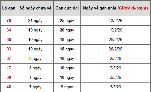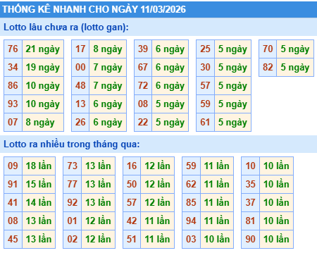 - Bảng thống kê lô gan Miền Bắc lâu chưa về tính đến ngày 11/3/2026