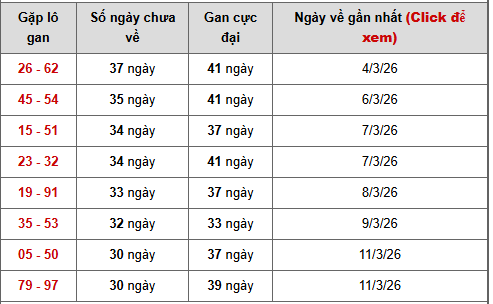 🔹26 – 62 đang gan 37/41 ngày, là cặp gan lâu nhất bảng, chỉ còn cách đỉnh gan 4 ngày, khả năng xuất hiện rất cao.