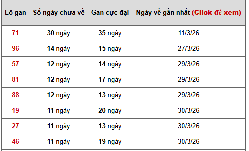 - Bảng thống kê lô gan Miền Bắc lâu chưa về tính đến ngày 11/4/2026