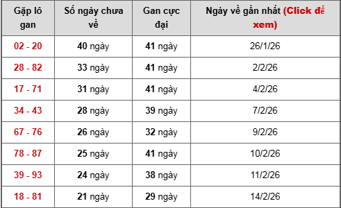 🔹02 – 20 đang dẫn đầu với 40 ngày chưa về, chỉ còn cách gan cực đại 41 ngày đúng 1 nhịp. Đây là dạng cặp lô thường được đánh giá rất cao vì khả năng “xả gan” có thể xảy ra bất cứ lúc nào.