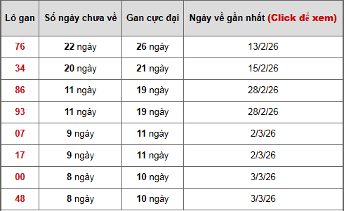 - Bảng thống kê lô gan Miền Bắc lâu chưa về tính đến ngày 12/3/2026