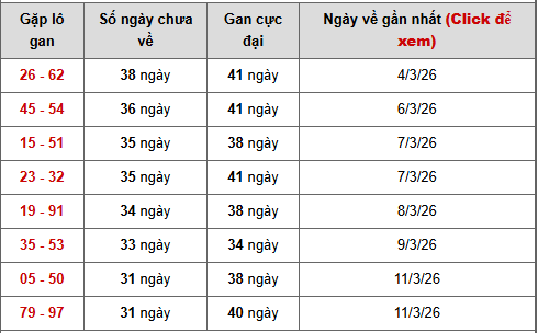Dựa trên bảng cặp số lô gan XSMB, có thể thấy dàn cặp số đang rơi vào vùng gan cực sâu từ 31 – 38 ngày, đây là giai đoạn cao điểm mà các cặp lô thường có xu hướng bật lại mạnh theo chu kỳ thống kê, vì vậy được nhiều người tham khảo khi dự đoán xổ số miền Bắc ngày 12 tháng 4 năm 2026.