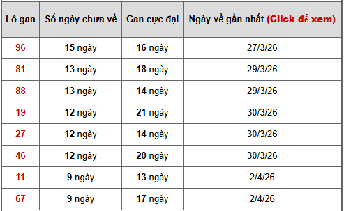 - Bảng thống kê lô gan Miền Bắc lâu chưa về tính đến ngày 12/4/2026