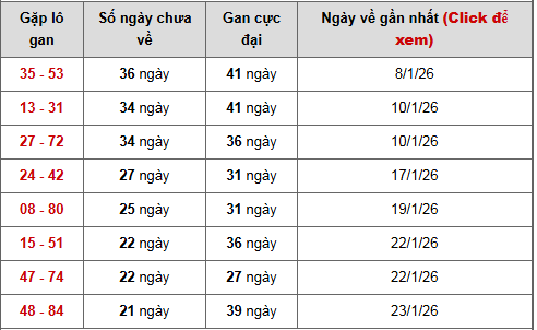 Tổng thể bảng thống kê cho thấy xu hướng gan đang dồn mạnh vào nhóm cặp số lâu ngày chưa xuất hiện, thường là tín hiệu cho khả năng xuất hiện lô rơi hoặc đảo chiều chu kỳ trong các kỳ quay gần nhất.