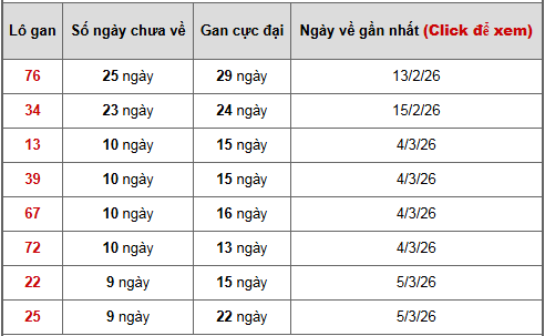 - Bảng thống kê lô gan Miền Bắc lâu chưa về tính đến ngày 15/3/2026