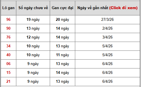 👉 Tổng thể bảng gan cho thấy 96 là lô đáng chú ý nhất khi đang sát gan cực đại. Bên cạnh đó 90, 76 và 40 cũng là những lô có chu kỳ gan đẹp, rất dễ xuất hiện trong các kỳ quay sắp tới theo thống kê, phù hợp để tham khảo khi soi cầu miền Bắc ngày 16 tháng 4 năm 2026.