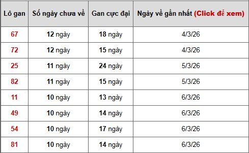 Theo xu hướng thống kê hiện tại, 67 – 72 – 25 là nhóm lô gan nổi bật nhất bảng, trong khi các số 82, 11, 49, 54 và 81 cũng đang tăng dần độ gan và có thể tạo bất ngờ trong các kỳ quay sắp tới. Đây là những con số thường được nhiều người tham khảo khi dự đoán xổ số miền Bắc ngày 17 tháng 3.