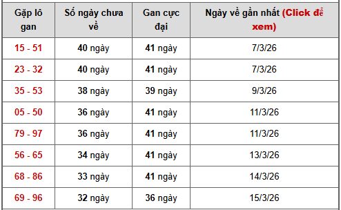 Dựa trên bảng cặp số lô gan XSMB, có thể thấy dàn cặp số đang dồn mạnh vào vùng gan cực sâu từ 32 – 40 ngày, đây là giai đoạn “đỉnh” của chu kỳ gan – nơi các cặp lô có xu hướng bật lại rất mạnh và dồn dập theo thống kê, vì vậy được nhiều người tham khảo khi dự đoán xổ số miền Bắc ngày 17 tháng 4 năm 2026.