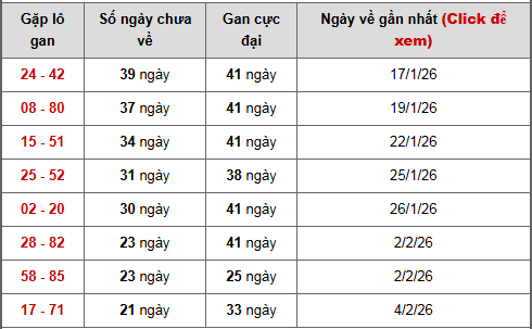 🔹24 – 42: Gan 39 ngày, chỉ còn 2 ngày chạm đỉnh 41 ngày → cặp gan dài nhất bảng, áp lực quay lại đang ở mức cao nhất.