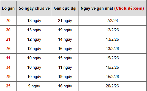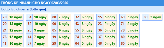 🔹Lô 70 dẫn đầu với 18 ngày chưa về, chỉ còn cách mức gan cực đại 21 ngày một khoảng ngắn, cho thấy khả năng xuất hiện trở lại đang tăng dần và được quan tâm nhiều trong các bảng dự đoán XSMB 2/3/2026.