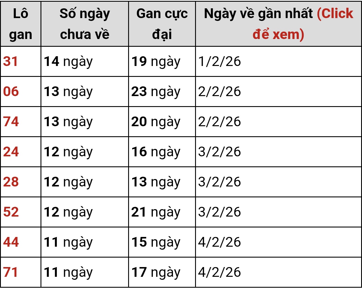 🔹 31: Gan 14 ngày, tiến sát đỉnh gan lịch sử, đang ở trạng thái dễ bật nhất. Con lô này thường được theo dõi khi soi cầu XSMB ngày 20/2/2026 vì khả năng phá gan khá rõ.