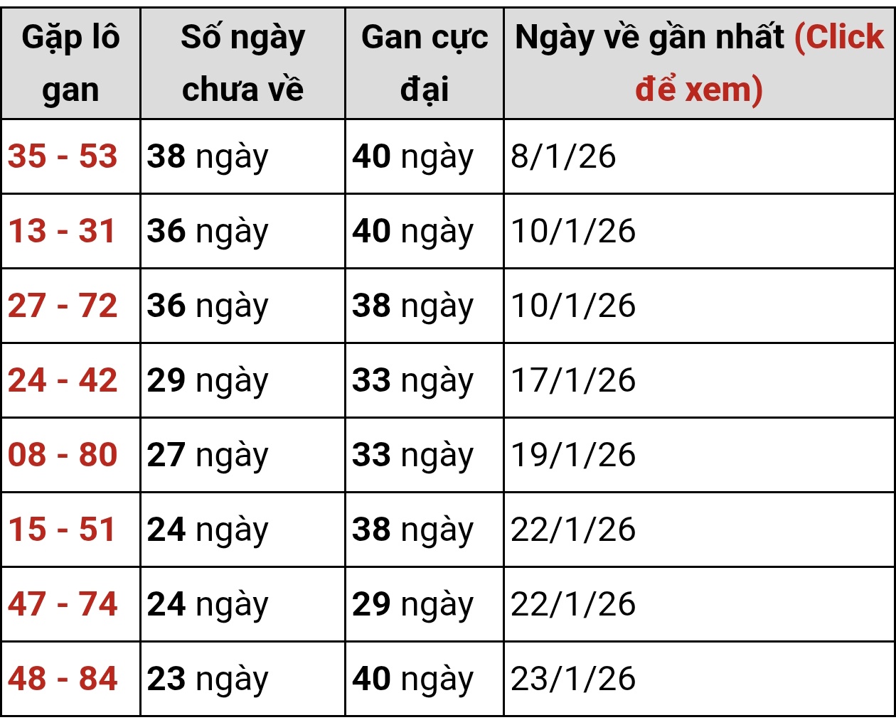 🔹35 - 53: Gan 38 ngày, tiến sát mốc cực đại, đang tạo tâm điểm bảng gan. Hai cặp này thường được quan tâm khi soi cầu XSMB ngày 20/2/2026 do khả năng bật lại cao.