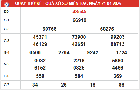 Đừng quên cập nhật bảng quay thử xổ số miền Bắc ngày 21/4/2026 hôm nay để kịp thời nắm bắt những con số tiềm năng cho dự đoán XSMB 21/4/2026. Kết hợp đối chiếu với dữ liệu các kỳ trước sẽ giúp bạn nâng cao độ chính xác khi lựa chọn con số may mắn.