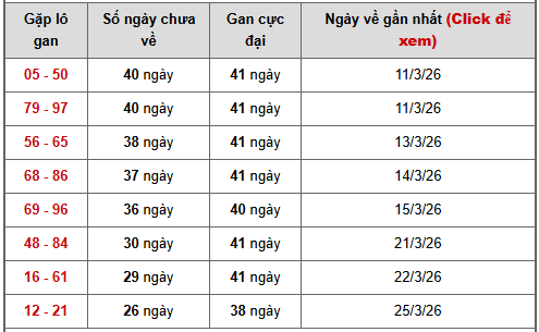 Dựa trên bảng cặp số lô gan XSMB, có thể thấy dàn cặp số đang dồn mạnh vào vùng gan cực đại từ 26 – 40 ngày, đây là giai đoạn “cao trào” của chu kỳ gan – nơi các cặp lô thường có xu hướng bật lại rất mạnh và liên tiếp theo thống kê, vì vậy được nhiều người tham khảo khi dự đoán xổ số miền Bắc ngày 21 tháng 4 năm 2026.
