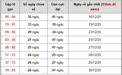 🔹05 – 50: Đã 36 ngày chưa xuất hiện, trong khi gan cực đại là 41 ngày → đang tiến sát vùng đỉnh lịch sử, khả năng quay lại trong thời gian ngắn khá rõ rệt.