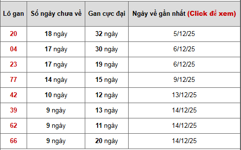 🔹Lô 20 (18 ngày), 04 (17 ngày), 23 (17 ngày) → đều đang ở mức gan cao so với mặt bằng chung.