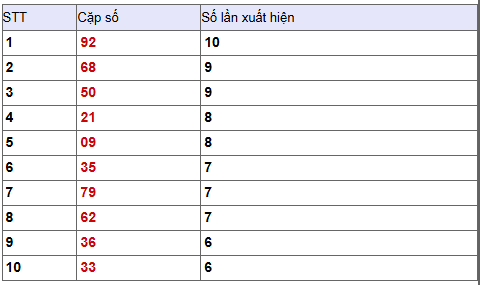 🔹92 đứng đầu với 10 lần, thể hiện tần suất nổi bật so với các số còn lại.