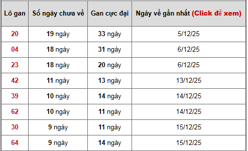 🔹 20 (19 ngày), 04 (18 ngày) và 23 (18 ngày) đang là những lô dẫn đầu về số ngày chưa xuất hiện. So với mặt bằng chung, đây là nhóm có mức gan cao, cho thấy dấu hiệu kéo dài rõ rệt.