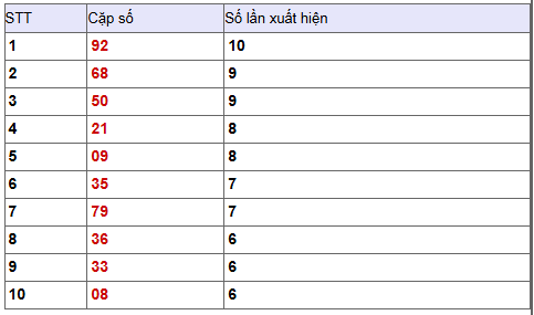 🔹 Cặp 92 dẫn đầu bảng với 10 lần góp mặt, cho thấy tần suất xuất hiện vượt trội và nổi bật hơn hẳn so với các số còn lại.