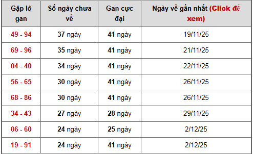 🔹 49–94 đang là cặp gan sâu nhất bảng với 37 ngày chưa về, tiến rất sát mốc gan cực đại 41 ngày. Với lịch sử gan dài và chu kỳ rơi không đều, cặp này được đánh giá rất cao khả năng bật số trong ngắn hạn, ưu tiên chốt mạnh.