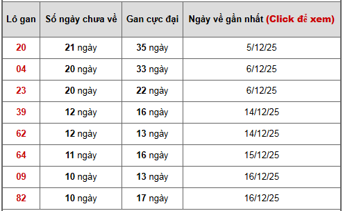 🔹 Nhóm lô gan cao đang vào vùng nhạy cảm gọi tên 20 – 04 – 23. Đây là những con số tích lũy gan dài ngày, dòng gan căng và đã vượt ngưỡng an toàn thông thường, rất dễ xuất hiện cú bung bất ngờ trong ngắn hạn.