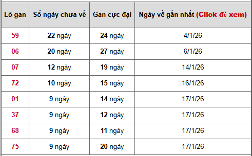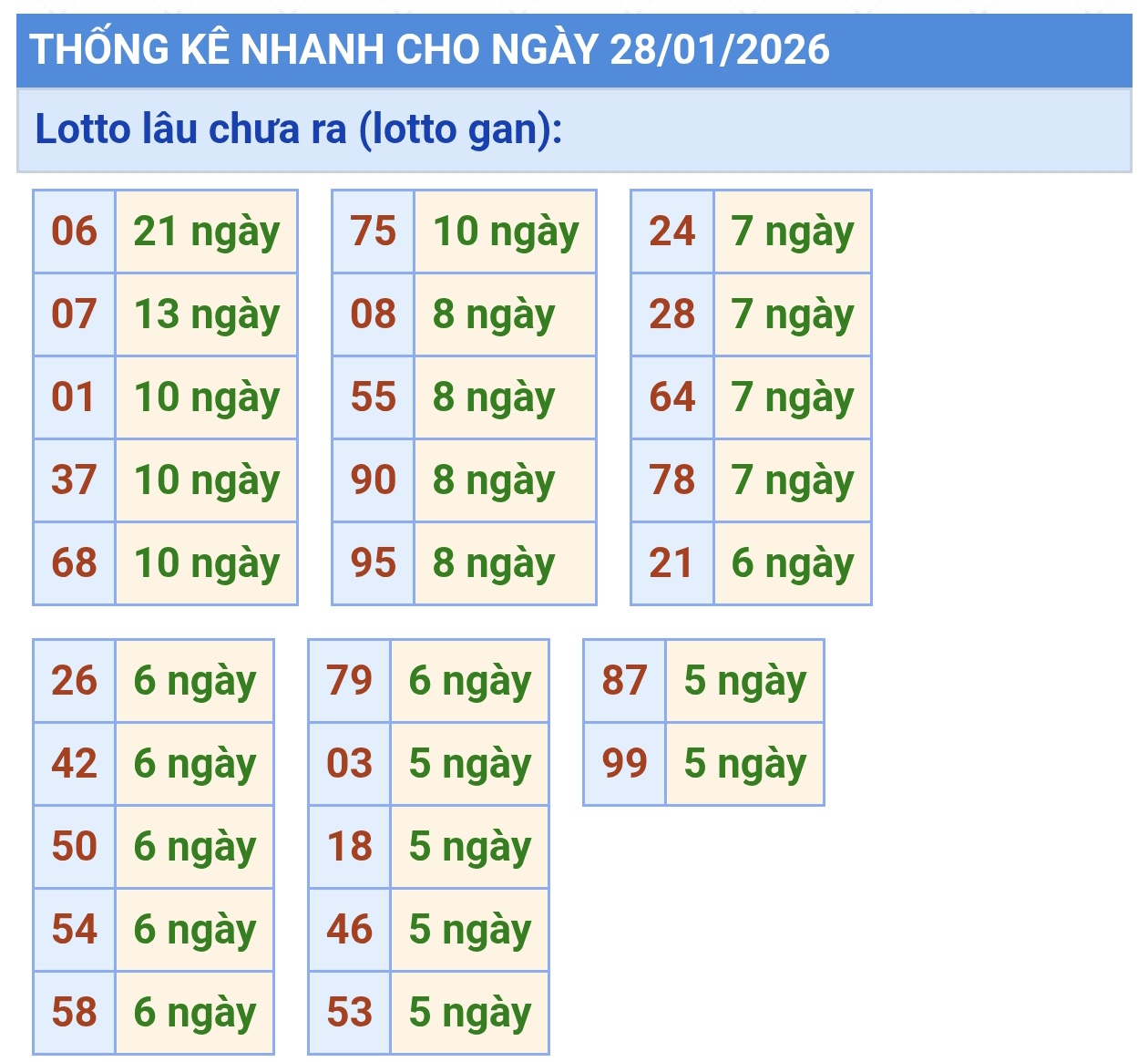 - Bảng thống kê lô gan Miền Bắc lâu chưa về tính đến ngày 28/1/2026