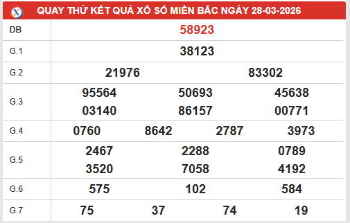 Khám phá bảng quay thử xổ số miền Bắc ngày 28/3/2026 với những con số nổi bật, được phân tích từ dữ liệu soi cầu xổ số miền Bắc ngày 28 tháng 3 năm 2026. Thống kê các kỳ trước giúp bạn dễ dàng chọn ra con số may mắn cho lần quay sắp tới.