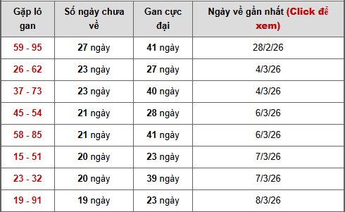 🔹59 – 95 đang gan 27 ngày, là cặp gan lâu nhất bảng và còn cách gan cực đại 41 ngày, vẫn có thể tiếp tục gan nhưng cũng rất dễ xuất hiện bất ngờ.