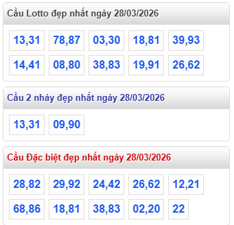 Lưu ý : "Quy luật đẹp nhất" là do hệ thống tự động tính toán theo một số tiêu chí mà XỔ SỐ WAP tính toán. Các bạn nên tham khảo dự đoán kết quả xổ số miền Bắc ngày 28 tháng 3 năm 2026 để tìm ra cặp xổ số đẹp nhất.