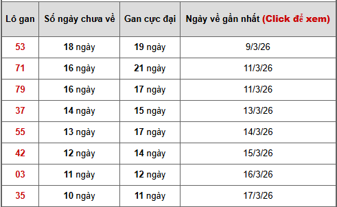 Theo bảng số liệu, dàn lô gan nổi bật nhất hiện tại là 53 – 79 – 37, tiếp theo là 71 – 55, đây là nhóm số đang ở vùng gan cao và sắp chạm gan cực đại. Nhiều người chơi thường tham khảo thêm dữ liệu khi dự đoán XSMB ngày 28/3/2026 để lựa chọn con số theo chu kỳ gan.