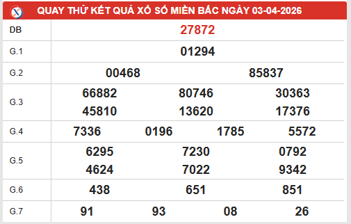 Khám phá bảng quay thử xổ số miền Bắc ngày 3/4/2026, nơi những con số nổi bật được phân tích tỉ mỉ từ dữ liệu dự đoán XSMB ngày 3/4/2026 mới nhất. Thống kê các kỳ trước sẽ giúp bạn chọn lọc bộ số may mắn, tối đa hóa cơ hội trúng giải lớn trong lần quay sắp tới.