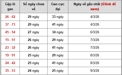 🔹26 – 62 đang có 29 ngày chưa về, gan cực đại 33 ngày, là cặp lô gan rất dài.