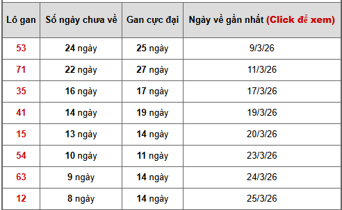 👉 Tổng thể bảng thống kê cho thấy 53 là lô đáng chú ý nhất vì đang sát gan cực đại, khả năng xuất hiện rất cao. Bên cạnh đó 71 và 35 cũng là các lô gan đẹp có thể cân nhắc theo thống kê chu kỳ gan, phù hợp để tham khảo trong dự đoán xổ số miền Bắc ngày mùng 3 tháng 4.