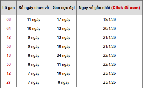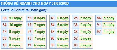 - Bảng thống kê lô gan Miền Bắc lâu chưa về tính đến ngày 31/1/2026