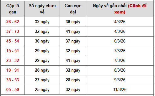 👉 Tổng thể bảng gan cho thấy 35–53 là cặp đang sát gan cực đại nên khả năng xuất hiện rất cao. Bên cạnh đó 26–62 và 37–73 là hai cặp gan dài nhất bảng, có thể xuất hiện trong các kỳ quay sắp tới theo chu kỳ thống kê gan, phù hợp để tham khảo trong dự đoán xổ số miền Bắc mùng 6 tháng 4.