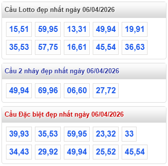Dữ liệu ngày 06/04/2026 cho thấy cầu đẹp tập trung mạnh vào 49 – 94 (xuất hiện ở cả Lotto, 2 nháy và Đặc biệt), đây là cầu rất sáng. Ngoài ra, các cặp 59 – 95, 35 – 53, 45 – 54 là cầu bền có thể theo.