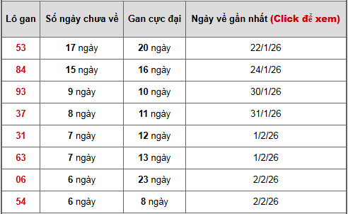 🔹 84: Gan 15 ngày, tiến sát mức gan cực đại 16 ngày. Những lô nằm sát đỉnh lịch sử thường có xu hướng xuất hiện đột ngột sau thời gian tích lũy kéo dài, rất đáng lưu tâm khi soi cầu XSMB ngày 9/2/2026.