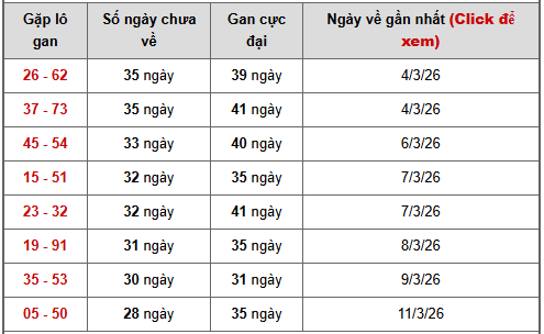 🔹26 – 62 và 37 – 73 cùng 35 ngày chưa về, trong khi gan cực đại 39 – 41 ngày → đây là hai cặp gan dài nhất bảng, đang ở vùng rất nhạy cảm.
