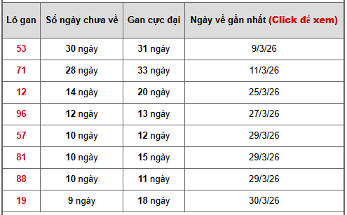 👉 Tổng thể bảng thống kê cho thấy 53 là lô sáng nhất khi đang sát gan cực đại, khả năng xuất hiện rất cao. Bên cạnh đó 71 và 96 cũng là những lô gan đẹp có thể bật về trong các kỳ quay sắp tới theo chu kỳ thống kê, phù hợp để tham khảo khi soi cầu miền bắc ngày mùng 9 tháng 4 năm 2026.