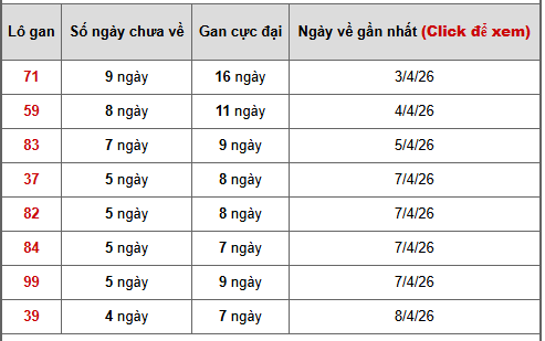 - Bảng thống kê lô gan Miền Nam ngày 13/4/2026